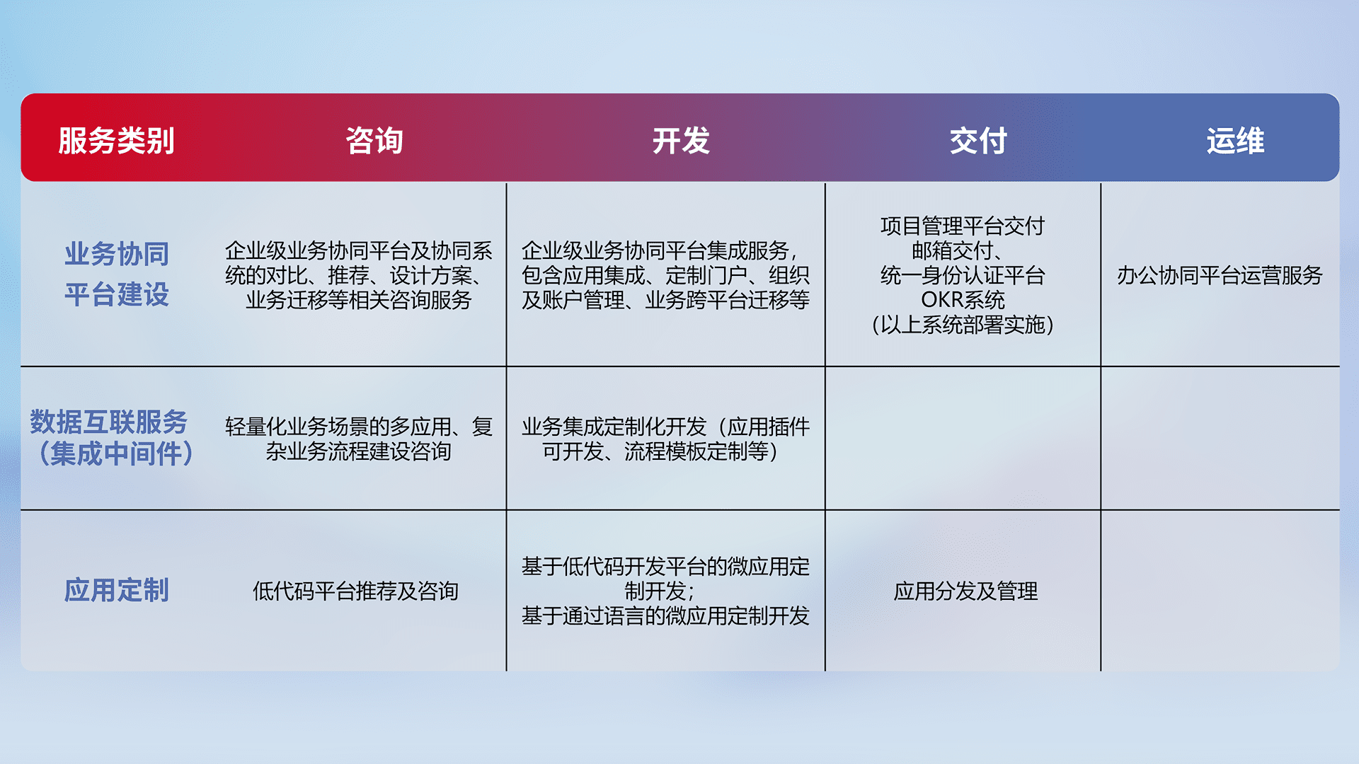 针对钉钉、、、、企微、、、IDaas等平台级产品提供产品的规划、、、方案、、、、交付、、、、定制化开发等服务,,,,实现如统一协同办公、、、智能客户服务、、混合会议管理、、、智能数据查询、、、等业务场景,,,实现数字化转型。。。。